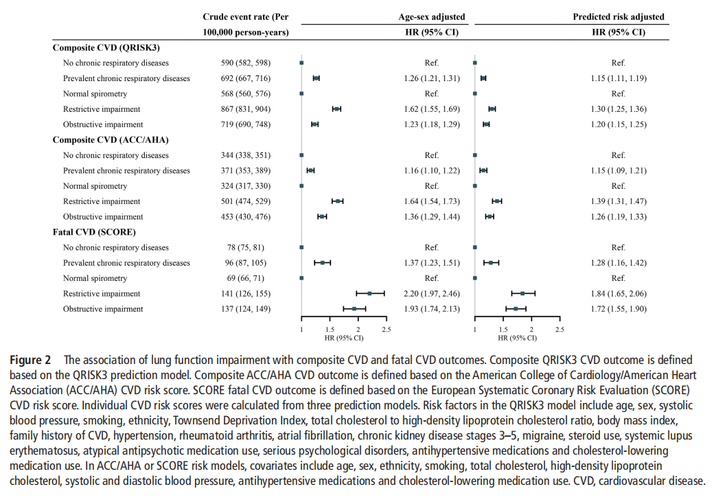 与正常肺活量测定相比,限制性和阻塞性损伤分别与CVD评分的校正HR 1.84(95%CI:1.65至2.06)和1.72(95%CI:1.55至1.90)相关。QRISK3 CVD也有类似的相关性(限制性与正常,调整后HR:1.30,95%CI:1.25至1.36;梗阻性与正常,调整后HR:1.20,95%CI:1.15至1.25)和ACC/AHA CVD(限制性与正常,调整后HR:1.39,95%CI:1.31至1.47;梗阻性与正常,调整后HR:1.26,95%CI:1.19至1.33)。