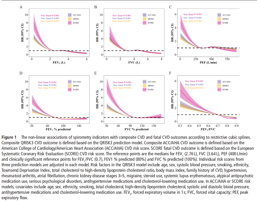 在中位12.5年的随访中,记录了21 885起QRISK3事件、12 843起ACC/AHA事件和2987起SCORE事件。肺活量测定参数与CVD结果的相关性呈L形。