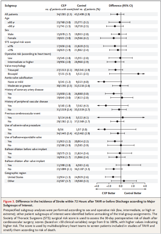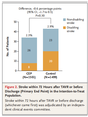 在1489名尝试使用CEP装置的患者中,有1406名(94.4%)成功使用了CEP装置。TAVR后72小时内或出院前(主要终点)的临床卒中发生率在CEP组和对照组之间没有显著差异(2.3%(1501名患者中的34名)vs 2.9%(1499名患者中的43名);差异,0.6个百分点;95%置信区间,-1.7 to 0.5;P=0.30);然而,正如95%置信区间所反映的,结果可能不排除TAVR期间CEP的益处。