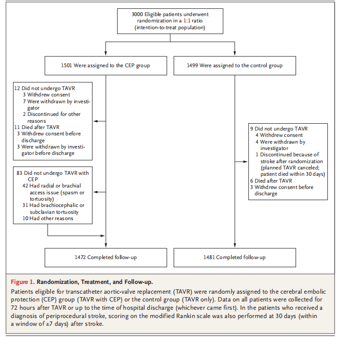 患者以1:1的比例被随机分配接受有CEP的TAVR(CEP组)或无CEP的TAVR(对照组)。在意向性治疗人群中,主要终点是TAVR后72小时内或出院前(以先到者为准)的卒中。卒中被定义为由出血或梗死导致的脑、脊髓或视网膜血管损伤引起的局灶性或整体神经功能障碍的急性发作。其它预先指定的终点包括卒中严重程度,使用改良的Rankin量表(范围为0至6,0分表示无症状,6分表示死亡)在30天(在±7天的窗口内)进行评估,非致残性卒中定义为得分<2分(或如果得分没有从卒中前基线得分增加,则定义为得分≥2分),致残性卒中定义为得分≥2分,从卒中前基线得分增加至少1分;任何原因导致的死亡;卒中、短暂性脑缺血发作或谵妄的复合终点;急性肾损伤;和CEP入口部位的血管并发症。