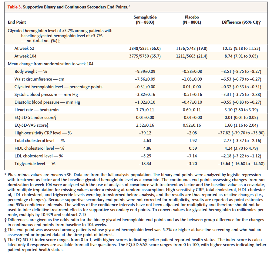 试验过程中体重和腰围的变化显示,随机分组后104周内,塞马鲁肽组的平均体重变化为-9.39%,安慰剂组为-0.88%(估计治疗差异为-8.51个百分点;95%可信区间为,-8.75 to 8.27)。