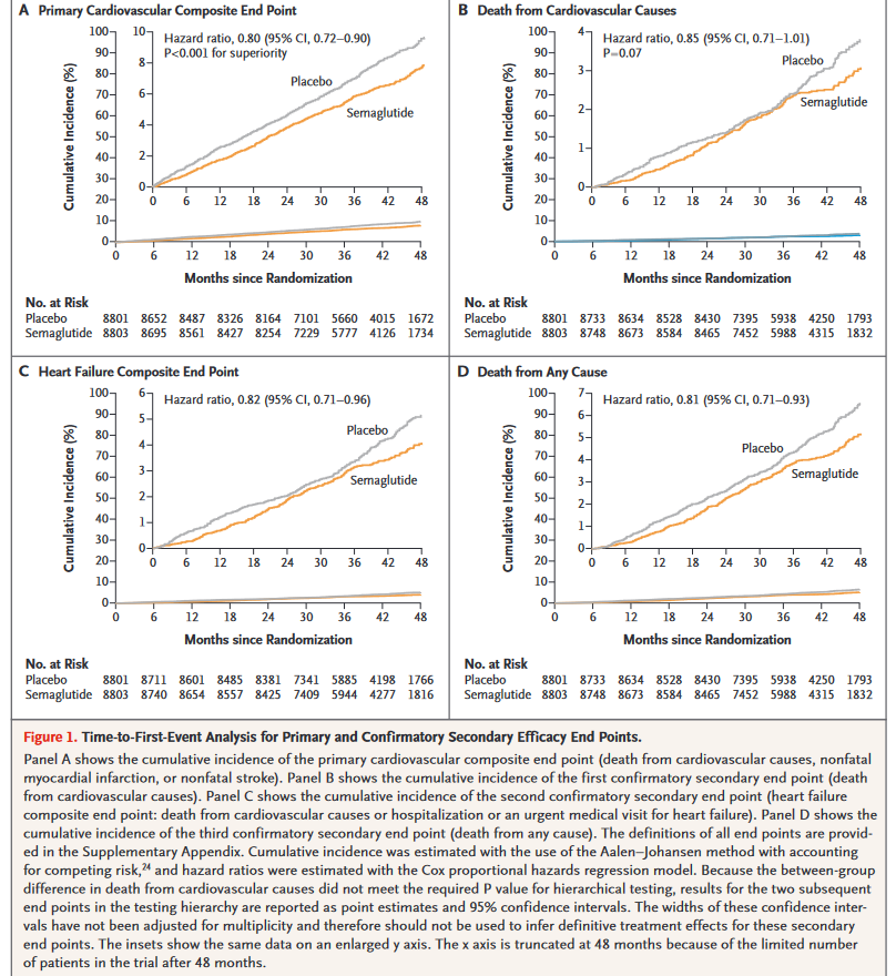 在一项多中心、双盲、随机、安慰剂对照、事件驱动的优势试验中,该研究招募了45岁或以上的患者,这些患者先前患有心血管疾病,体重指数为27或以上,但没有糖尿病史。患者以1:1的比例被随机分配到试验组和对照组,试验组的受试者接受每周一次皮下注射2.4 mg剂量的塞马鲁肽,对照组的受试者皮下注射同等量的安慰剂。主要心血管终点是心血管原因死亡、非致死性心肌梗死或非致死性卒中的复合物。在首次事件时间分析中评估并按等级顺序测试的确认性次要终点是心血管原因死亡、复合心力衰竭终点(心血管原因死亡或住院或因心力衰竭紧急就诊)和任何原因死亡。