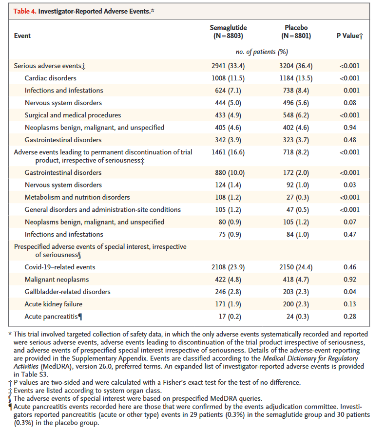 塞马鲁肽组有2941名患者(33.4%)报告了严重不良事件,安慰剂组有3204名患者(36.4%)报告了严重不良事件(P<0.001)。导致永久停用塞马鲁肽或安慰剂的不良事件发生在塞马鲁肽组的1461名患者(16.6%)和安慰剂组的718名患者(8.2%)(P<0.001)。
