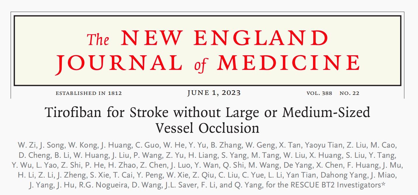 陆军军医大学第二附属医院(新桥医院)杨清武、资文杰教授团队开展的多中心随机对照试验“RESCUE BT2”于2023年6月1日在《NEJM》杂志发表,文章题为《Trial of Endovascular Therapy for Acute Ischemic Stroke with Large Infarct》。研究通过在中国1177例有中重度卒中症状,且无大中型血管闭塞的患者中比较静脉输注替罗非班48小时和口服阿司匹林90天联合治疗与口服阿司匹林90天治疗的疗效,发现对于替罗非班组患者90天实现优良结局的百分比显著高于阿司匹林组,且两组死亡率无明显差异。文章第一作者为资文杰教授,宋加兴博士、孔维遴博士、黄嘉诚博士为共同第一作者,杨清武教授为通讯作者。