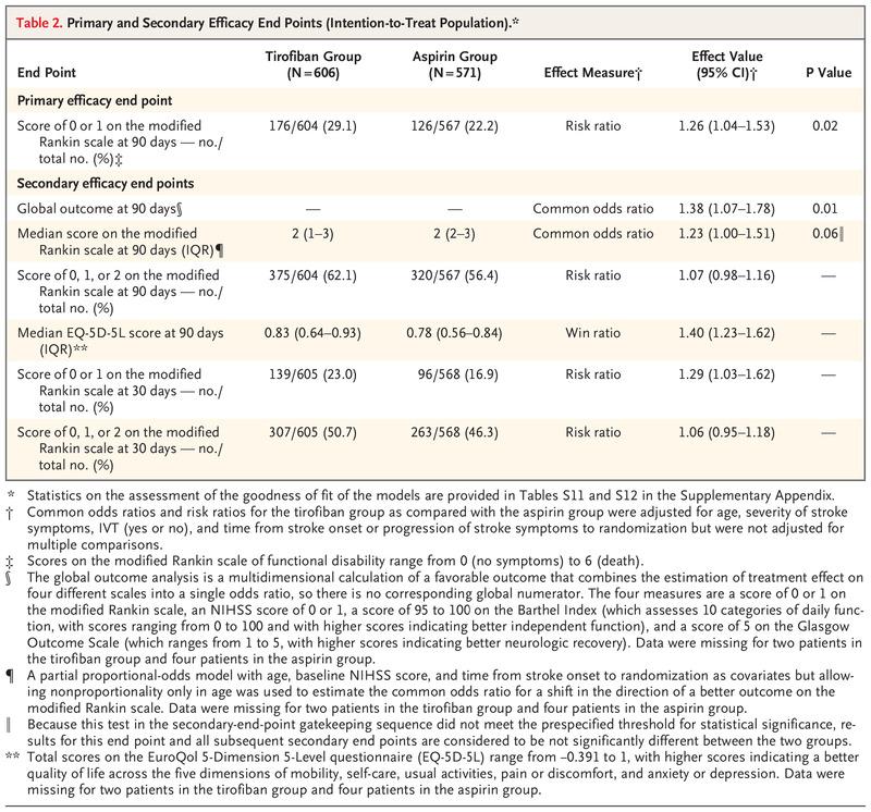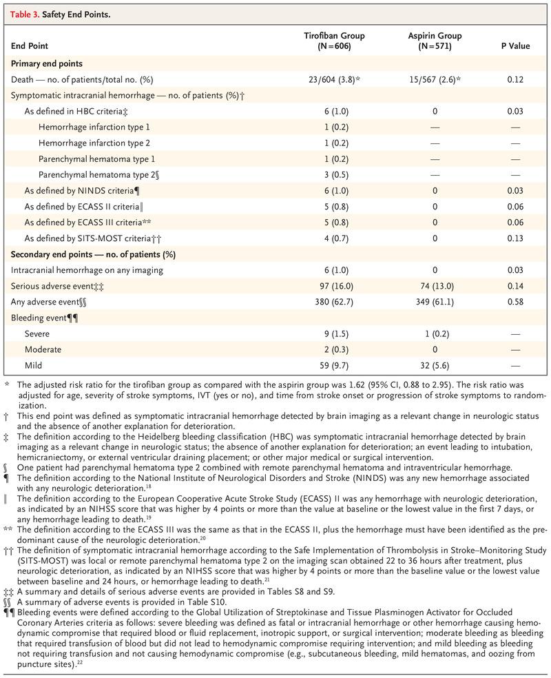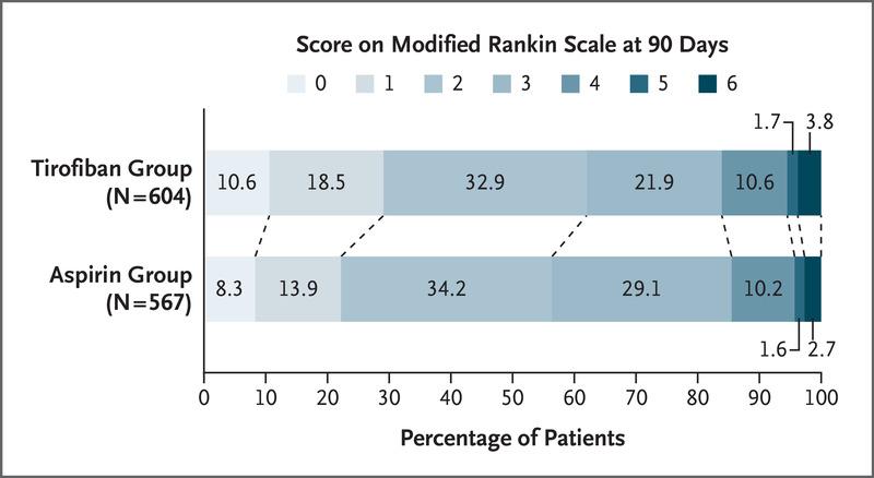 在mRS评分中,90天时评分为0或1分的患者比例替罗非班组为29.1%,阿司匹林组为22.2%(调整后的风险比为1.26;95%CI=1.04 ~ 1.53,P=0.02)。次要结局的结果一般与主要分析的结果不一致。两组的死亡率相似。替罗非班组症状性颅内出血发生率为1.0%,阿司匹林组为0%。