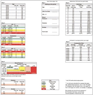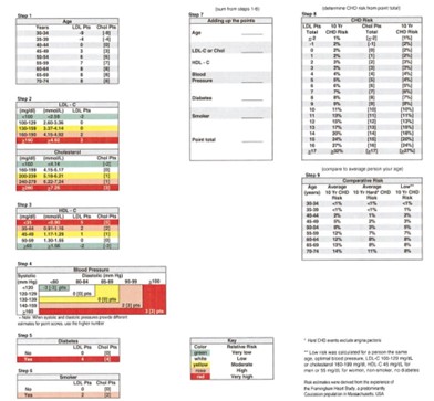 如下图所示,根据评估个体的性别选择不同的评分依据,然后根据个体的年龄、总胆固醇水平(或低密度脂蛋白水平)、高密度脂蛋白水平、收缩压和舒张压水平、是否患有糖尿病与吸烟分别得到6个分数,分数相加即可估计出10年内患冠心病的平均风险。
